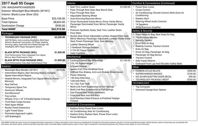 You can't buy the wrong vehicle at Valley Pre-Owned! Check out the rest of the great features on this car. Black Optic Package (High Gloss Black Pkg w/Exterior Body Color Mirrors and Wheels: 9.0J x 19" 5-Arm-Rotor Design), Black Optic Plus Package (Gloss Black Exterior Mirrors and Wheels: 9.0J x 20" 7-Double-Spoke Design), Technology Package (Audi Adaptive Light, Audi Side Assist, HDD Navi w/Voice Control, Parking System w/Rearview Camera, and Radio: 1 CD/DVD-Player & HD), 14 Speakers, 4-Wheel Disc Brakes, 8.5J x 18" 5-Parallel-Spoke S-Design Wheels, ABS brakes, Air Conditioning, Alloy wheels, AM/FM radio: SiriusXM, Auto-dimming door mirrors, Auto-dimming Rear-View mirror, Automatic temperature control, Brake assist, Bumpers: body-color, CD player, Compass, Delay-off headlights, Driver door bin, Driver vanity mirror, Dual front impact airbags, Dual front side impact airbags, Electronic Stability Control, Four wheel independent suspension, Front anti-roll bar, Front Bucket Seats, Front Center Armrest, Front dual zone A/C, Front fog lights, Front reading lights, Garage door transmitter: HomeLink, Headlight cleaning, Heated door mirrors, Heated Front S Sport-Contoured Seats, Heated front seats, High intensity discharge headlights: Xenon plus, Illuminated entry, Knee airbag, Leather Shift Knob, Leather steering wheel, Leather/Alcantara Seat Trim, Low tire pressure warning, Memory seat, Occupant sensing airbag, Outside temperature display, Overhead airbag, Overhead console, Panic alarm, Passenger door bin, Passenger vanity mirror, Power door mirrors, Power driver seat, Power moonroof, Power passenger seat, Power steering, Power windows, Radio data system, Radio: Bang & Olufsen Sound System, Rain sensing wipers, Rear air conditioning, Rear anti-roll bar, Rear fog lights, Rear reading lights, Rear seat center armrest, Rear window defroster, Remote keyless entry, Security system, Speed control, Speed-Sensitive Wipers, Split folding rear seat, Sport steering wheel, Steering wheel mounted audio controls, Tachometer, Telescoping steering wheel, Tilt steering wheel, Traction control, Trip computer, Turn signal indicator mirrors, and Variably intermittent wipers.